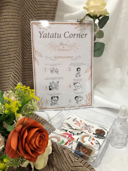 Você pode personalizar vários designs com seus nomes, data do casamento, ilustrações e outros detalhes especiais. Além disso, você também pode escolher alguns designs da nossa galeria de casamentos em Yatatu-bodas. Enviaremos tudo o que você precisa para montar sua própria estação de tatuagem temporária self-service no seu casamento.